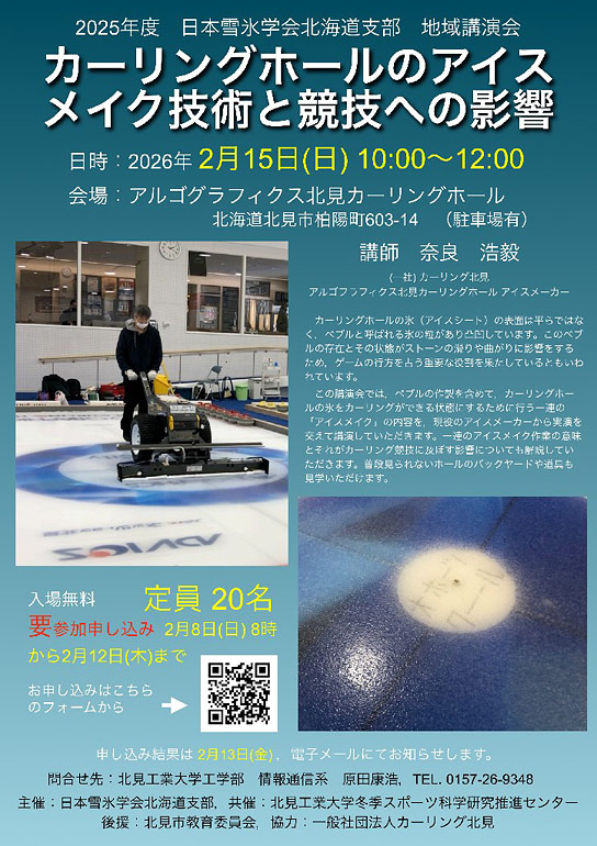 この講演会では、ペブルの作製を含めて、カーリングホールの氷をカーリングができる状態にするために行う一連の「アイスメイク」の内容を、現役のアイスメーカーから実演を交えて講演していただきます。一連のアイスメイク作業の意味とそれがカーリング競技に及ぼす影響についても解説していただきます。普段見られないホールのバックヤードや道具も見学いただけます。