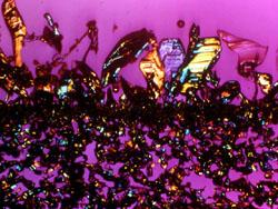 <表面霜が雪面に形成されたときの雪面近傍のアニリン薄片写真(鉛直断面)>![]() 粒径3mm程度の表面霜結晶が上方に向かって成長した様子がわかる。表面霜の根元には薄い緻密な層がみられ、雪面への水蒸気輸送の集中によって形成されたと考えられる。 (写真提供:八久保晶弘会員) |