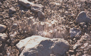 霜柱は地表面に垂直に成長し、地表付近の土や石を持ち上げる。霜柱によって持ち上げられた土砂は、傾斜地では元の位置には戻らず斜面下方へと移動する。霜柱は斜面物質移動を引き起こす。(大雪山) (写真提供:曽根敏雄会員) |