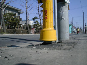 地中のパイプが凍着凍上により地面の凍上と共に持ち上がる。地表から融解が始まり地面が沈下しても、地中の凍結部にパイプがある間は、凍着力によりパイプは沈下しないために地面から浮き上がる。(札幌市) (写真提供:曽根敏雄会員) |