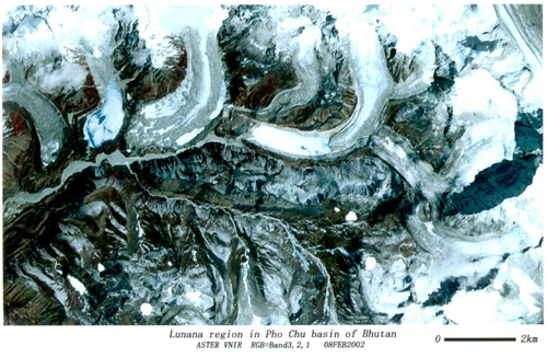 <ルナナ氷河湖群> ブータンヒマラヤ:ルナナ地方の氷河と氷河湖(ASTER人工衛星画像.2002年2月) (写真提供:山田知充会員) |