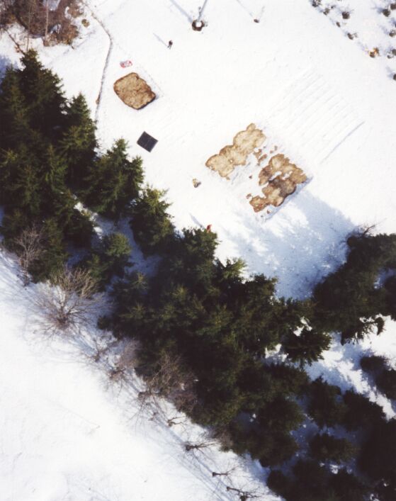 <布による融雪促進効果の実験風景(ラジコンヘリから撮影)>![]() |