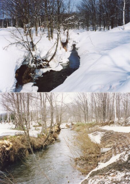 <融雪によって増水した山地源流域河川(下)と融雪前の状況(上)>![]() 母子里・融雪観測室わきの美深越沢川(流域面積約11km2)にて (写真提供:石井吉之会員) |