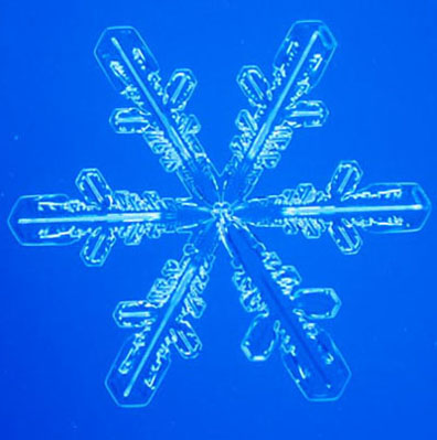 | 大雪山ではしばしばきれいな六花の雪結晶を見ることができます。雪は上空の気 温と水分量を反映して様々な形へと成長します。(1)は角板、(2)は広幅六花、(3)は樹枝状六花と呼ばれる結晶です。中には(4)のように樹枝状六花を2つ組み合わせた十二花が見られることもあります。(写真提供:尾関俊浩会員) | |